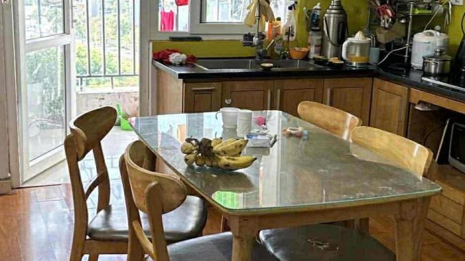 - Kệ bếp gỗ, tủ bếp trên dưới đầy đủ.