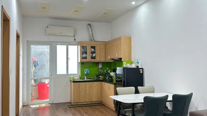 Nội thất căn hộ đã làm cơ bản gồm: Sàn gỗ, tủ bếp, nóng lạnh, điều hòa, giường, tủ, tủ lạnh…